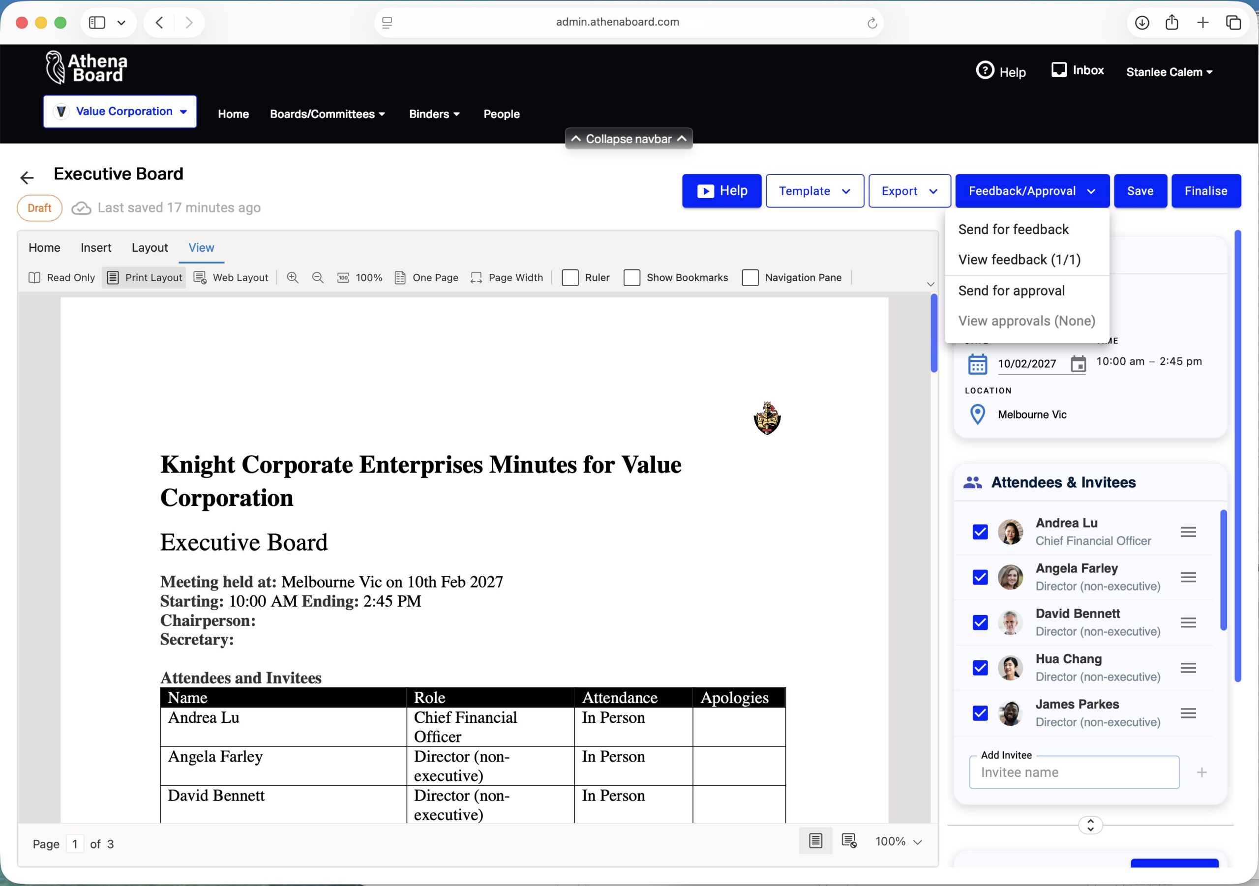 Easily send out minutes to selected users for feedback and review before the minutes are approved. The review and feedback cycle can continue if required and include any or all the board members.