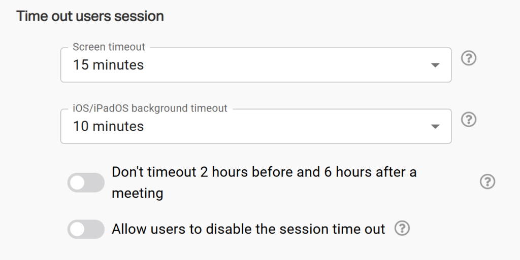 There are also options to allow users to disable the timeout by clicking on the disable timeout icon in top nav bar of the apps (screenshot), and also whether or not the timeout should be active 2 hours before and 6 hours after the meeting date in the currently viewed binder.