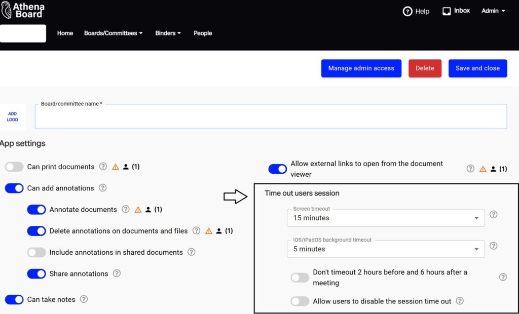 The Athena Board app will automatically detect and logout the app after a period of inactivity from a user or admin.