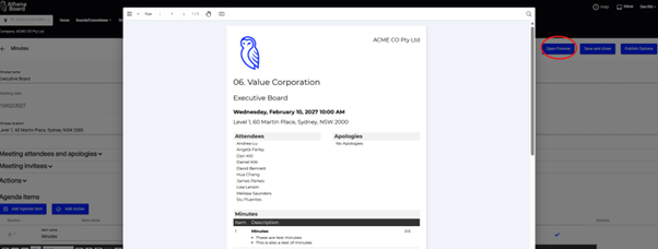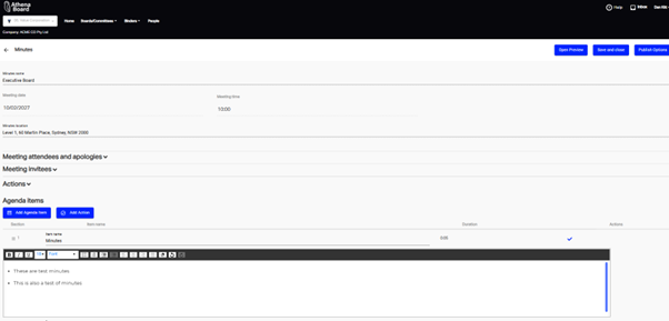Athena Board will automatically pre-populate a minutes template using the binder data, including the date, time, location, attendees, and agenda items.