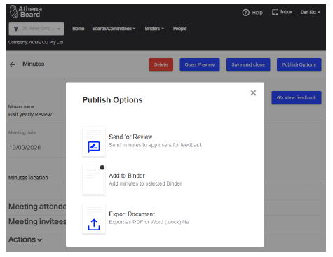 This guide explains how to create, edit, review and finalise meeting minutes using Athena Board. The Minutes feature allows administrators to quickly generate professional minutes by pulling information from an existing board pack, collaborating with reviewers, and exporting or signing off the final version.