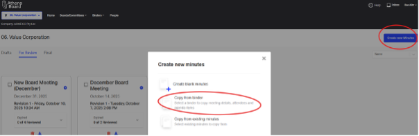Select Create New Minutes > Copy from Binder. Choose the relevant binder.